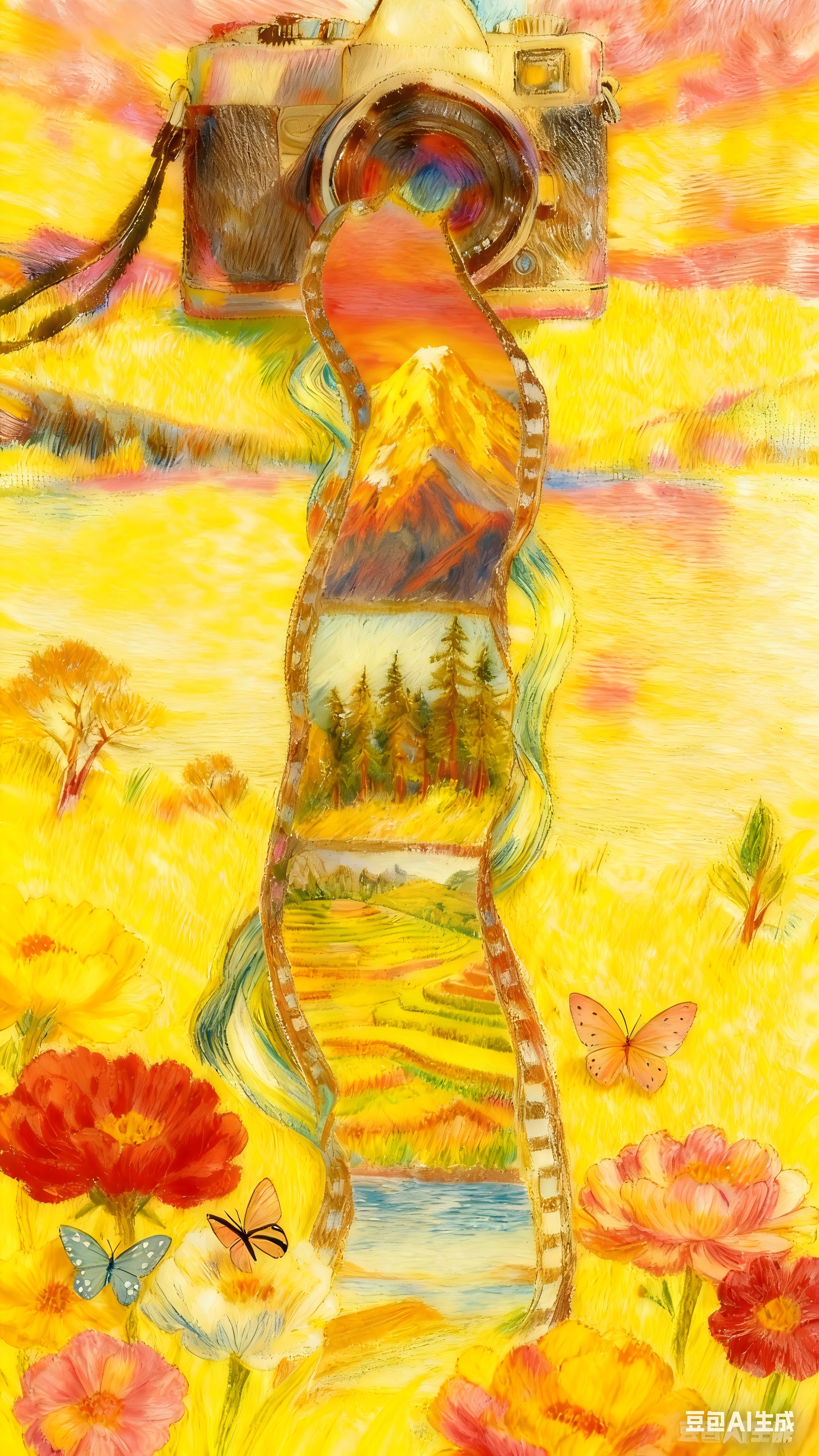 创作说明: 生活之美,藏在那些不期而遇的日常碎片里。这幅作品以胶片为核心载体,将镜头对准平凡日子里的细碎美好,用错落的繁花与灵动的蝴蝶点缀背景,既保留了胶片本身的复古质感,又通过鲜活元素传递出生活的生机与暖意。