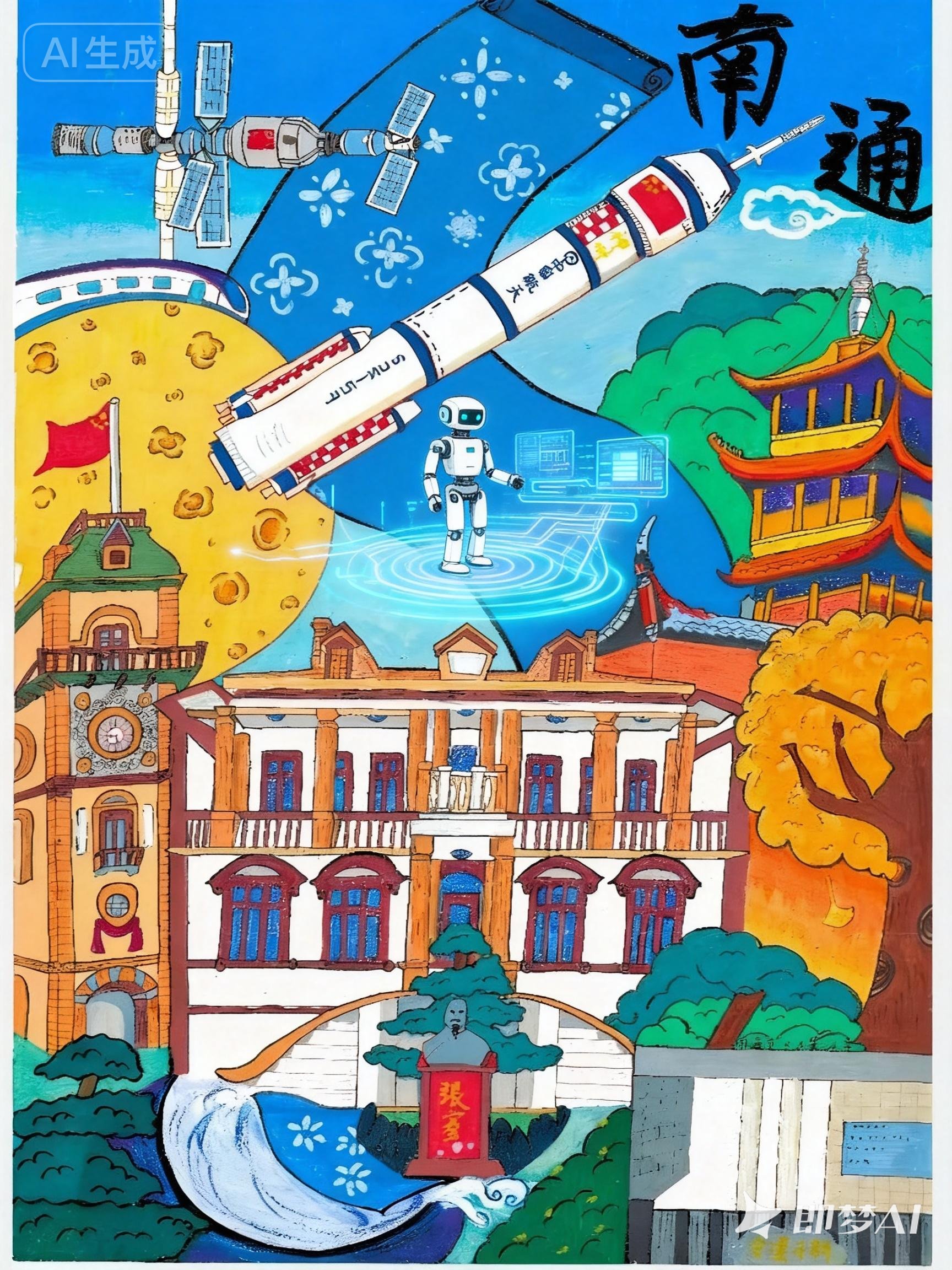 创作说明: 《江海文韵》绘画作品结合AI技术,融合南通的人文底蕴与航天科技,将钟楼、传统楼阁等城市地标与火箭、空间站、机器人等科幻元素碰撞交织,张謇文化符号与江海意象相映,以绚烂的色彩和奇幻的构图,展现南通从历史底蕴走向科技未来的蜕变,诠释城市兼具古韵与创新的独特魅力。