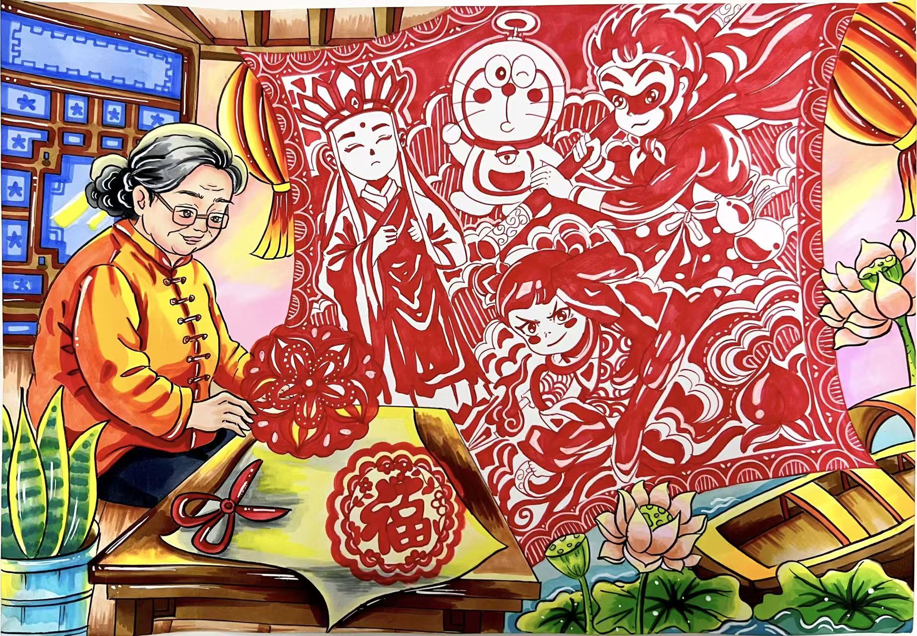 创作说明: 这幅作品以“动漫无界,友城共绘”为主题,将扬州非遗剪纸技艺与中外动漫形象巧妙融合。画面中心,戴老花镜的奶奶正在剪纸,桌上“福”字剪纸与莲花纹样传递传统文化温度。图中,孙悟空、唐僧等动漫角色与哆啦A梦围在一起化作剪纸纹样,东西方动漫形象在非遗传承场景中打破次元壁,生动诠释“友城共绘”的联结。背景中,传统窗棂与灯笼营造市井烟火气,与剪纸元素呼应,展现非遗技艺的当代活力。飘落的剪纸化作莲花、祥云等吉祥图案,既象征文化传承的生生不息,又暗喻动漫作为世界语言,让不同文化在剪纸艺术中交融共生。整幅画通过温馨场景,将技艺传承与跨文化交流融为一体,成为“以剪为媒,动漫传情”的童趣表达。