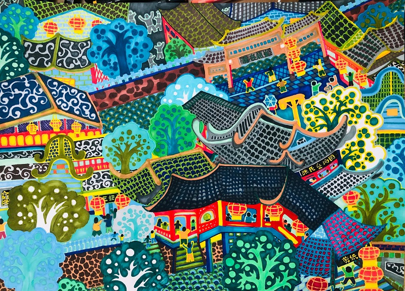 创作说明: 《市井录》这一画名,凝练地捕捉了扬州东关街风情与民间蓝绿农民画风格的交融精髓。“青蓝”直指画面主导的靛青、湖蓝与石绿色调,这是农民画中源于乡土、充满生命力的色彩语言,清澈明亮,如同水乡浸染过的天空与流水;“市井录”则寓意这是一卷对繁华街巷日常生活的生动记载,饱含观察与叙事的温度。