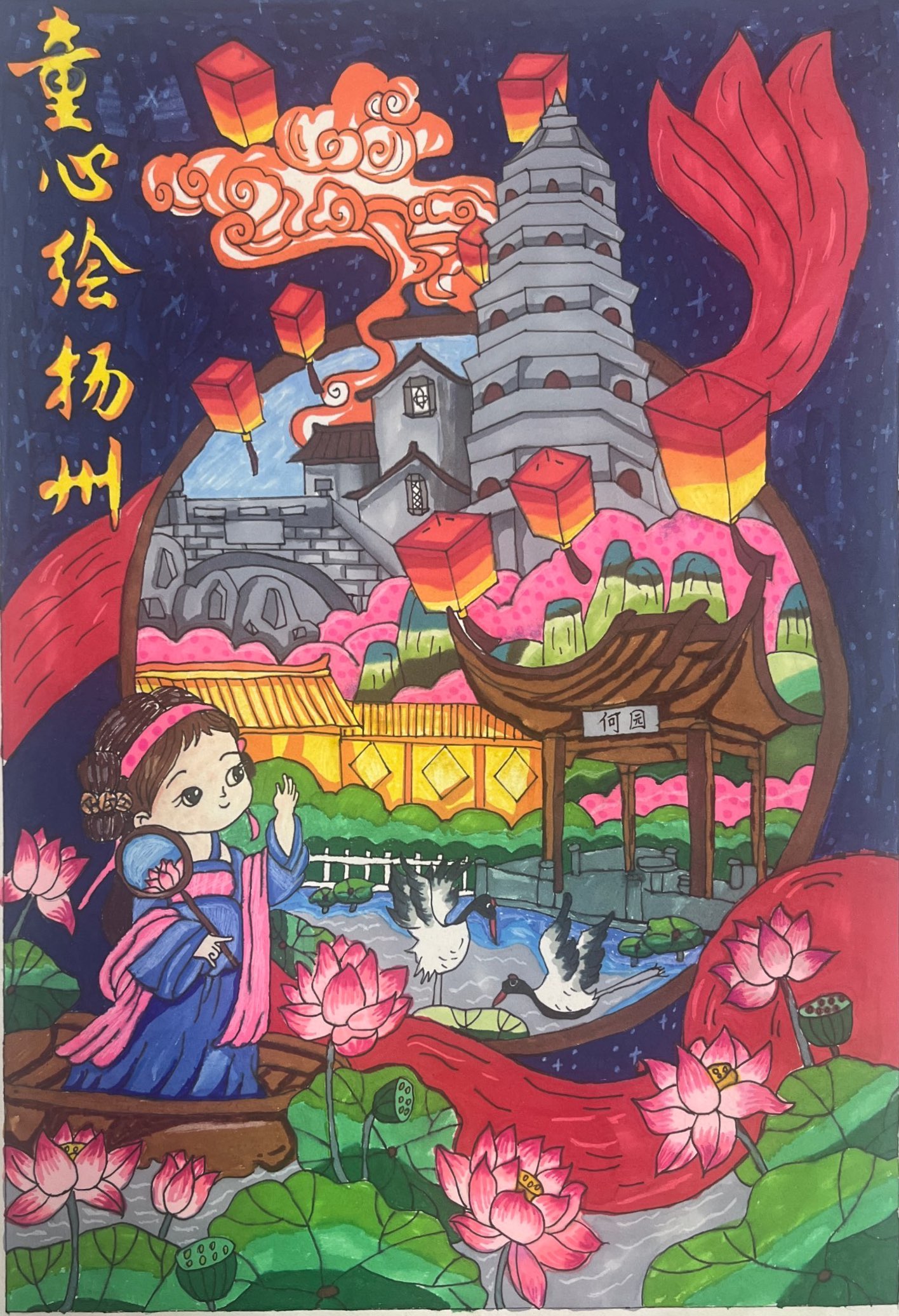 创作说明: 以“童心绘扬州”为核心,选取扬州地标建筑、何园、荷花等地域符号,搭配古风孩童、孔明灯等元素,深蓝色夜空衬托暖色调的建筑与花卉,营造出灵动又温馨的氛围。用童趣的视角勾勒扬州的水乡之美与人文底蕴,表达对家乡的热爱与对传统文化的童真解读。