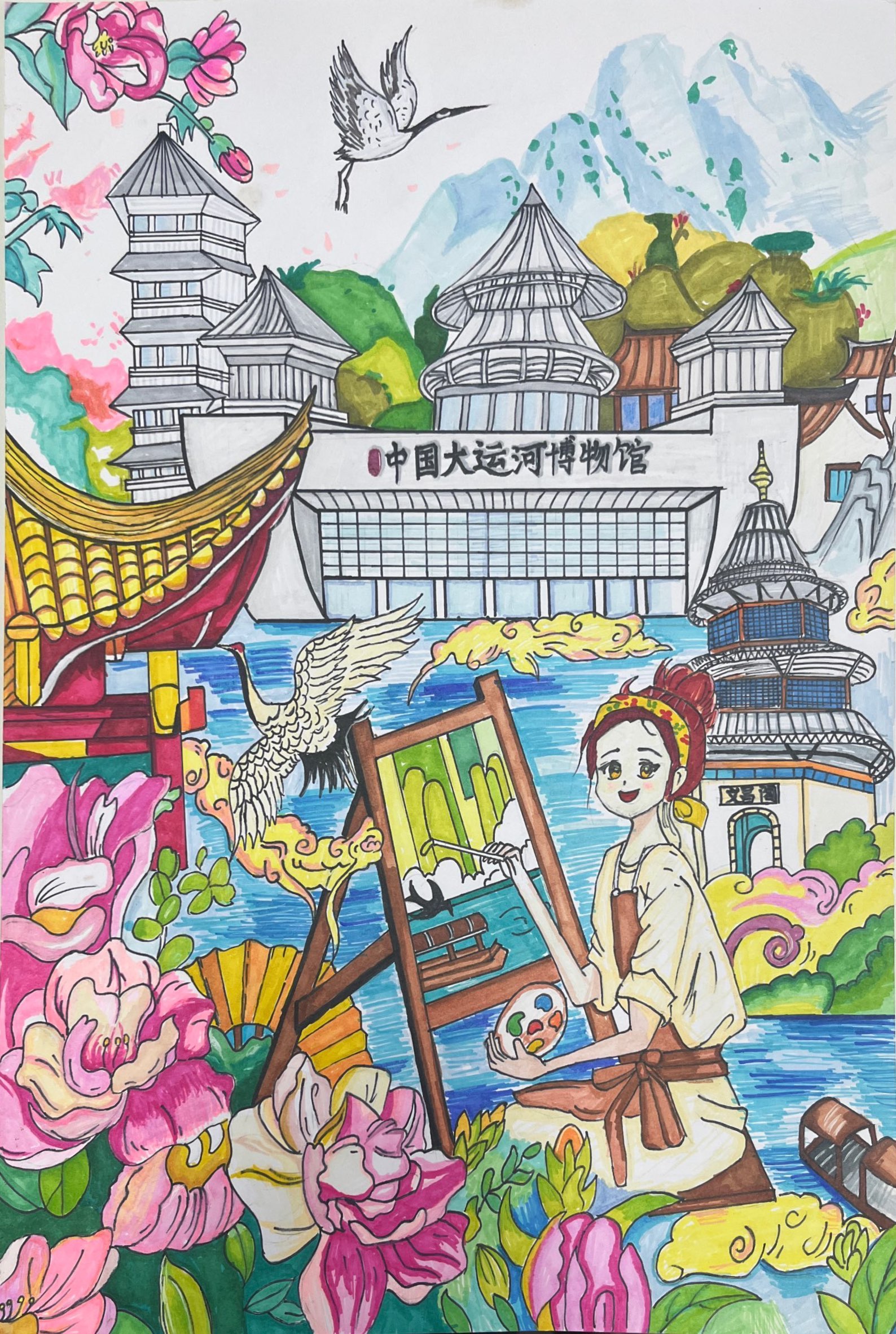 创作说明: 以中国大运河博物馆为主体,结合仙鹤、牡丹、中式亭台等元素,画面中作画的人物既是创作者也是观赏者,以绘画的形式定格运河文化的厚重与秀美。色彩明快、元素丰富,既展现大运河博物馆的建筑特色,又以花鸟、山水烘托运河文化的千年底蕴,表达对运河文化的赞美与传承。