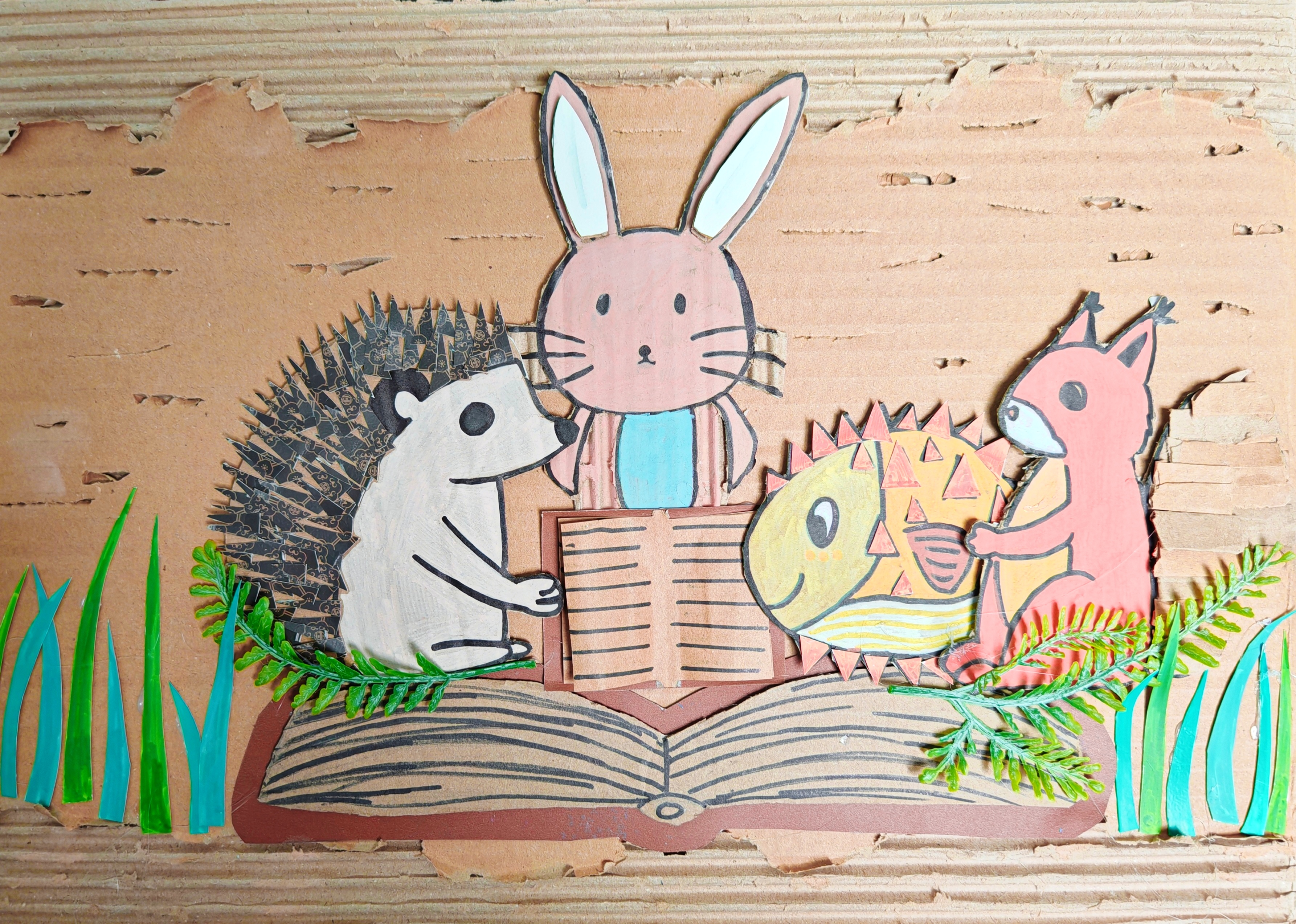 创作说明: 这个作品是镇江扬中市油坊中心小学三年级小朋友的作品:在这本超有趣的手工小书里呀,来自镇江扬中的河豚宝宝,正捧着绘本看得入神,看着看着,它竟 “噗通” 一下从绘本里游出来啦!它摇着圆乎乎、像小气球似的身子,一扭一扭闯进了森林。小刺猬正用尖刺小心翼翼地搬运浆果,瞧见河豚,好奇地凑过去;长耳朵兔子竖着耳朵,蹦蹦跳跳地围过来,大眼睛里满是惊喜;红狐狸甩着蓬松的大尾巴,欢快地迎上前,它们都围过来和河豚宝宝玩,森林里顿时充满了咯咯咯的笑声,就像我们读故事时,想象着书中角色蹦出来和自己做朋友一样,热闹极啦。