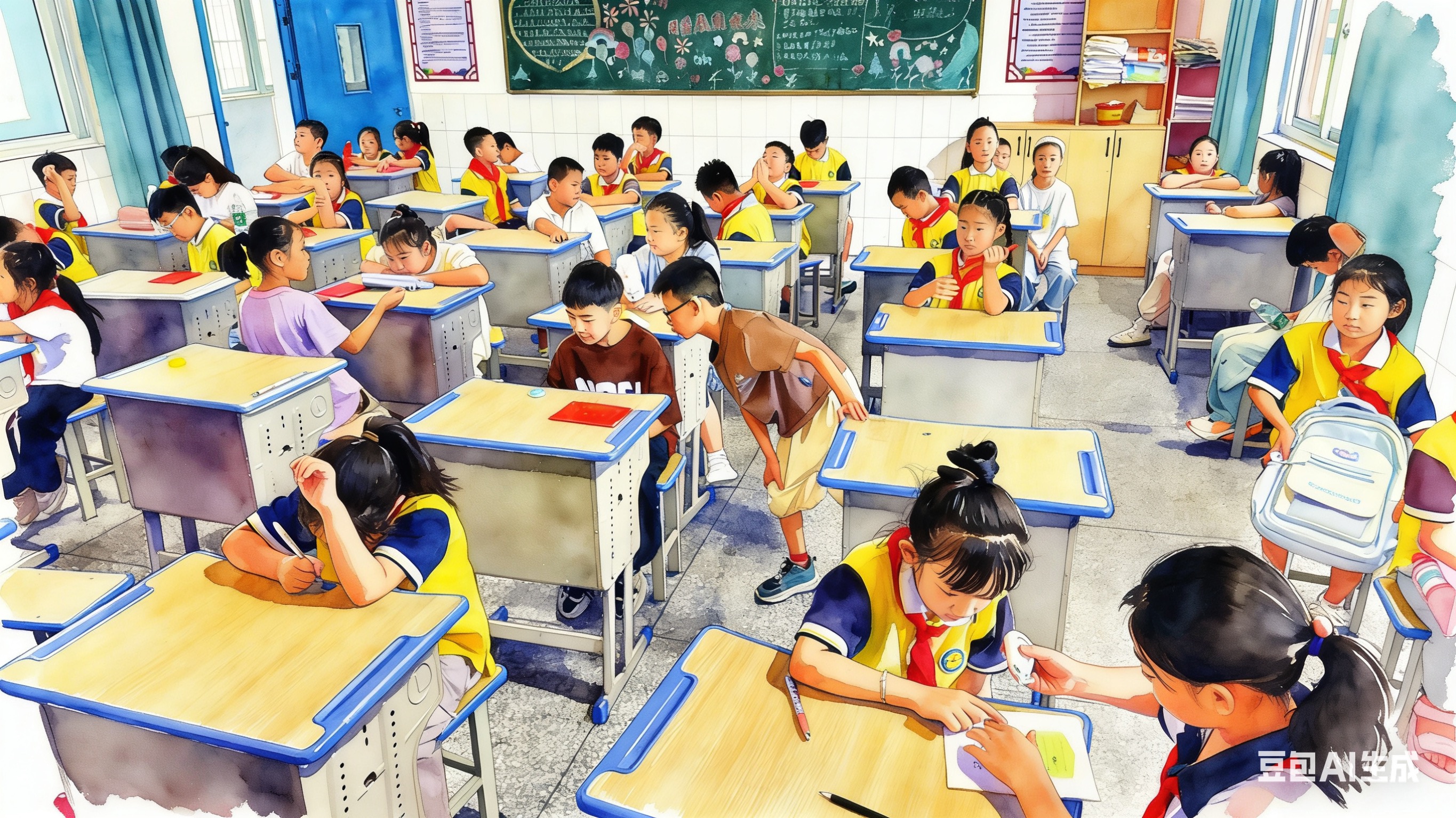 创作说明: 这幅作品以开学第一天为创作背景,聚焦教室场景,展现丰富细节:用明亮色彩、生动人物神态,呈现开学时的活力与朝气,传递期待、兴奋情绪,唤起对校园生活的美好共鸣。教室布置、学生着装、互动行为,真实还原开学首日校园日常,承载青春回忆与成长印记。借开学这一特殊节点,定格学生重返校园的瞬间,诠释校园生活的纯真、质朴,以及新学习阶段开启的希望,引发对青春、成长、求知的情感联结。